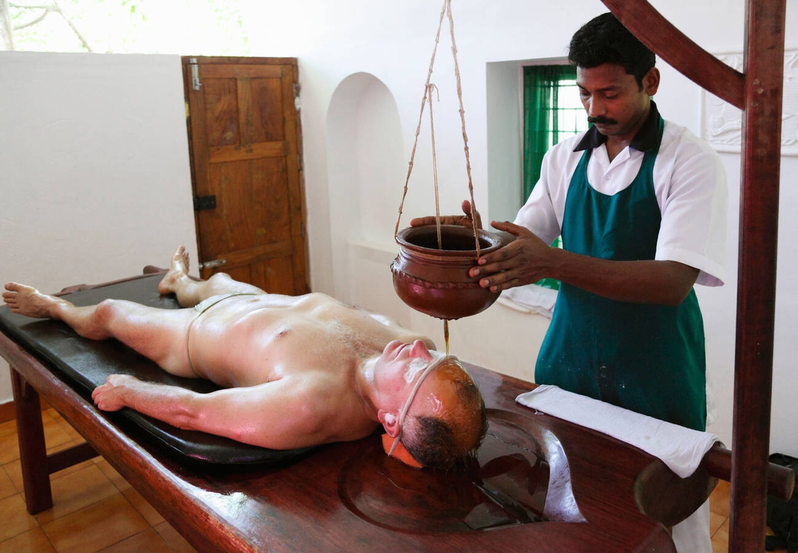 Shirodhara is a calming Ayurvedic therapy where warm herbal oil is gently poured on the forehead to calm the nervous system.